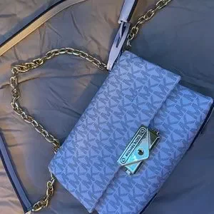 it had a gold chain handle with the cream whote strap, its a very cute little handbag. its a cream white and gray bag. It has never been used.