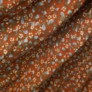 Orange/rust colored floral print dress. Orange background with light blue flowers. Zip and hook closure in back. Ruffle accents. Deep v-neck. Falls above knees. Pre-owned.