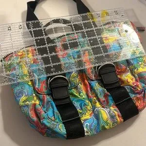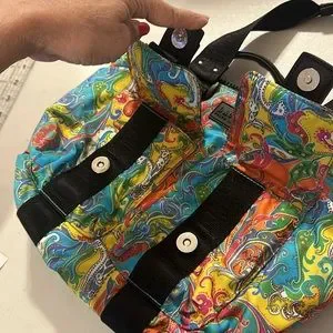 This Lauren Ralph Lauren tote handbag features a vibrant paisley pattern on durable nylon material. The medium-sized bag has double handles and a zip closure with silver and black hardware accents. The exterior has convenient outer pockets with magnetic clips and the interior contains an inner pocket for additional organization with a zipper. The black lining complements the multicolor exterior, making it a stylish accessory for any outfit. This tote is perfect for any occasion, whether it's a day out with friends or a trip to the office.