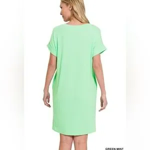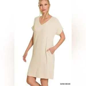 Zenana Sand Beige Short Cuffed Sleeves and Functional Pockets Tee Shirt Dress