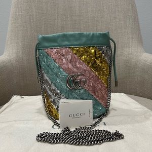 Gucci sequins bucket bag in very good condition, barely used. Some sequins are upside down. Has 3 cc pocket inside and a key holder. Calfskin leather in very good condition. Piping in excellent condition. Aged removable chain strap in excellent condition. Very clean inside/out.