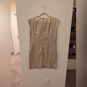 Gorgeous gold metallic linen dress with beautiful gold tone grommets at the V neck line. Hidden back zipper and two flapped flat pockets in the front. Fully lined.