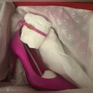 Pump silhouette, patent leather body, stiletto heel, pointed toe, ankle strap adorned with gold-tone vlogo, fully lined
