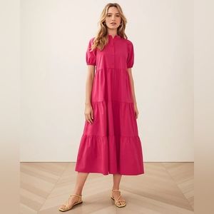 Versatile and endlessly flattering, our tiered midi shirtdress is on the go and always in style. Jewel neck. Short shirred raglan sleeves with elasticized cuffs. Button front placket. Shirred skirt tiers.