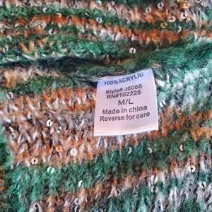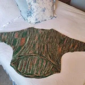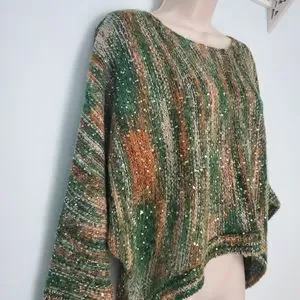 Excellent used condition fun sequin sweater in shades of rust brown, beige & green. Dolman sleeves and a hi-lo hem make for a relaxed fit. Ribbed knit at hem & cuffs. Bought new & only worn once, it looks brand new. No stains, holes or signs of wear. Wear as a topper over a camisole or t-shirt. Would be a great look for St. Patrick's Day!