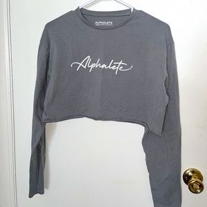 Alphabet cropped signature long sleeve shirt, Tundra Grey, size M, worn once or twice and maintained great condition (following wash standards). Material is cotton and spandex, and is loose fitting. Can be worn as a gym shirt/cover-up or as an everyday long-sleeve.