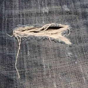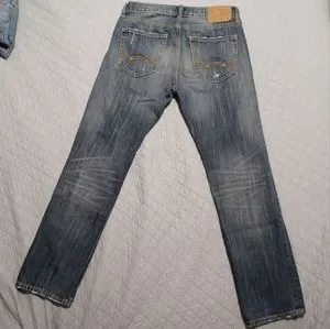 American Eagle Outfitters men's jeans size 29x32 in the slim straight style with factory made distress and fading. The highest hole has a black patch under it due to it being close to the pocket (pictured). 100% cotton and doesn't have a lot of stretch to it. Great preowned condition with minimal signs of wear.