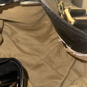 @dejanew2 This is what an authentic Jimmy Choo Mahala looks like. Notice the logos on the nameplates are the same and Made In Italy is heat stamped under the interior nameplate. Research before listing.