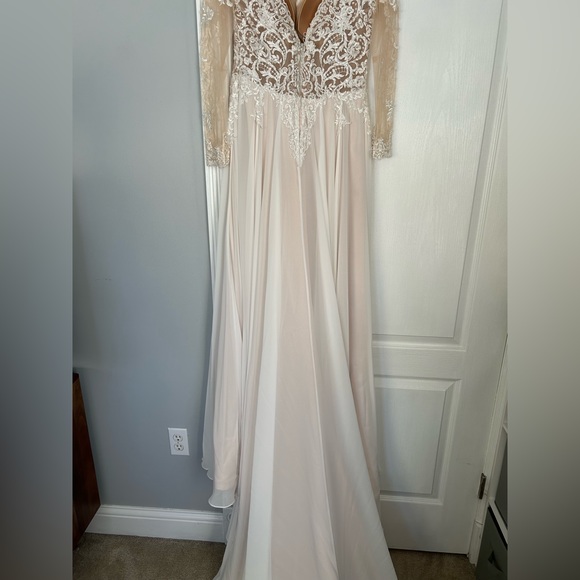 Never worn, only tried on. New in garment bag with tag. Tags are in garment bag, not attached to the dress. Shown in photos. Dress is kept stored in garment bag.