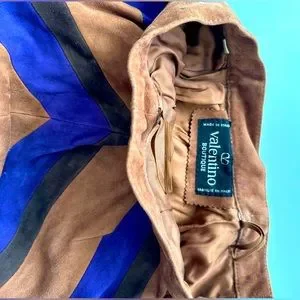 This is a vintage classic authentic suede 1970s-80s diagonal striped Valentino boutique skirt. It’s fully lined in satin twill and has a side zip and button closure. Size 40. Made in Italy