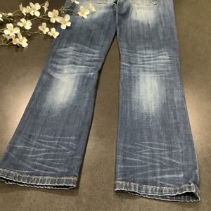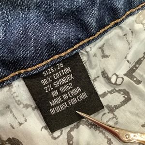 GUC Standards & Practices jeans, size 28. Five pockets, zip fly. Medium wash with factory fading, whiskering, and heavy distressing (rips). Some wear of fly button and light staining on leg fronts, see photos. 98% cotton and 2% spandex, minimal stretch. Approximate measurements laid flat: