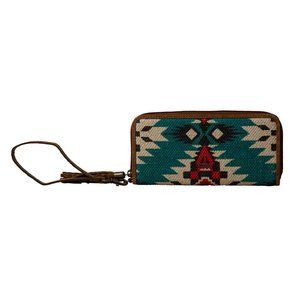 Amazing color combinations make this wallet truly eye-catching. The upcycled woven rug features hues of red, turquoise, ivory and charcoal. Special accents in warm chocolate leather outline the edges and tassel. Removal wristlet strap for another option to carry. Interior features spacious sections, including a zippered pocket. Wrap-around zipper closure keeps everything snug and secure. A beautiful, eye-catching design! BRAND NEW WITH TAGS!
