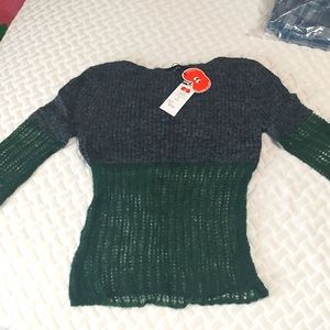 Super soft and slim fitting boat neck knitted grey/evergreen sweater, beautiful mesh knitted sleeves and lower torso (the loose mesh is see through but the grey knitting is not. Never worn, tags still on. Flared sleeve cuffs. Super unique and fun