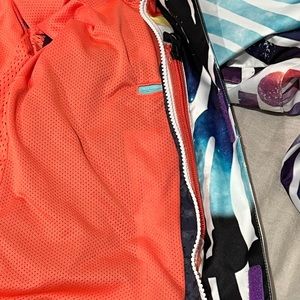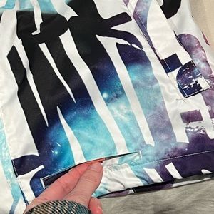 A fun, bright snowboard shell in excellent condition. There are two external zippered pockets. One zippered pocket on the chest just inside the Velcro weather flap (the orange vertical line in photo 3). The hood has a built in visor (photo 3). The arm pits are zippered for ventilation (photo 4). There is an addition inner pocket and snow guard (photo 6). Photo 7 shows it is possible to bring a cord/wire from the internal chest pocket up through the horizontal teal slit in case you use wired headphones. Photos 8/9/10 showcase a secret pocket with card holder that comes out of the bottom of the jacket for easy access for lift passes/credit cards/IDs.
