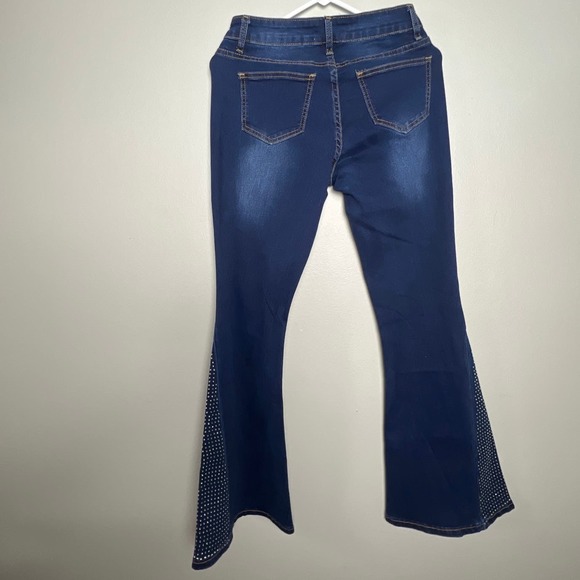 The high-rise design adds a touch of sophistication, while the flare cut brings a trendy and flattering silhouette. The attention to detail is evident in the exquisite embellishments that set these jeans apart from the rest. The sparkling accents on the hems add a glamorous touch, making this pair perfect for various occasions.