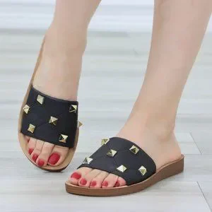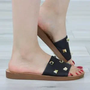Black Flat Comfort Flexible Sandal Slip On Sliders Trendy Gold Studs Glittery To
