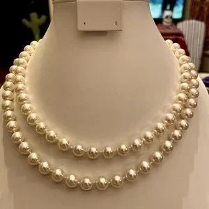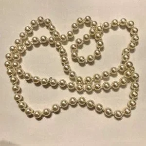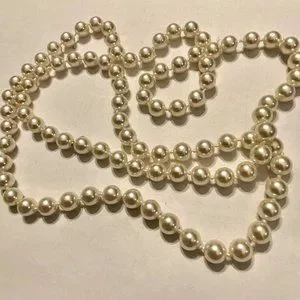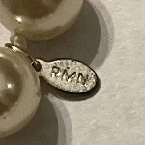 This is a classic 20" faux pearl necklace by RMN Jewelers. It's in pristine, preloved condition. It doesn't have a clasp so it is worn as one long strand.