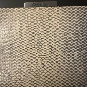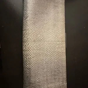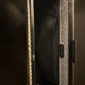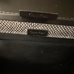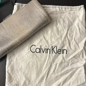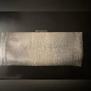 Used Calvin Klein Circa 1990’s silver snake print leather clutch.