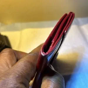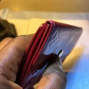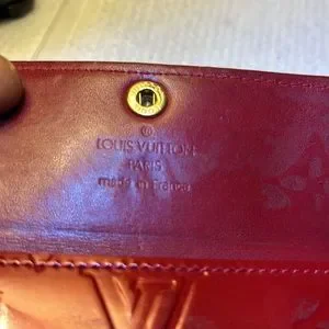 Louis Vuitton red Vernis Wallet. This is a used wallet! Absolutely amazing condition! Some very light rubbing on the corners, and exterior.snaps works perfectly, No odor. Has two pockets, one zip pocket in the middle, and two card slots on the front. Does have a date code in the corner of the pocket and is authentic!