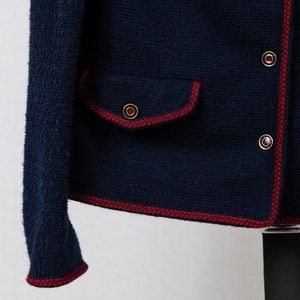 Color navy blue with red trim details neckline, cuffs, pockets
