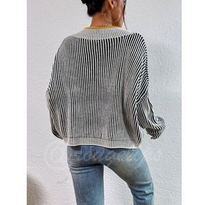 Oversized Rib Knit Striped V-Neck Black Gray Pullover Sweater
