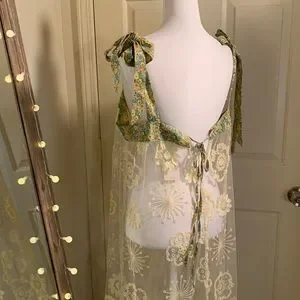 Features: Sheer fabrication with embroidered detail, straight neckline, contrast trim, adjustable shoulder straps, tie detail at back, ruffle detail at hem for added dimension