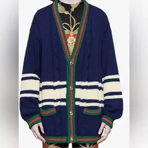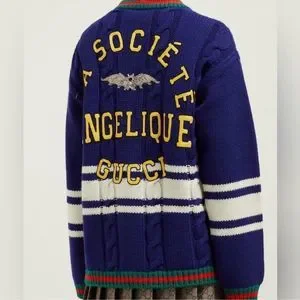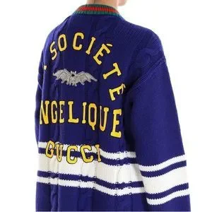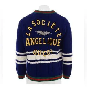A preppy inspired silhouette, the oversize wool cardigan, features details that speak to the inspiration shown on the Cruise 2019 runway. Embroidered with crystals, the bat displayed on the back evokes the spectral setting, while the phrase "La Société Angelique" references the group of poets, writers, and scholars formed in 16th century France, during the "Lyon Renaissance," and considered to be the forerunner of literary societies. Blue wool. Green and red knit rib trim. White stripe details. On the back "La Société Angelique" Gucci patch with crystal embroidered bat patch. Gold-toned metal Double G buttons. V-neck. Patch pockets. 100% wool. Made in Italy.