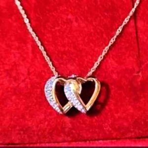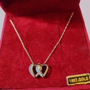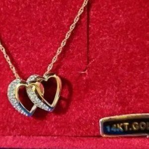 Diamonds make us feel special. Sparkly. Dare we say a little like a princess? Enjoy a royal moment whenever you wear this diamond double heart pendant. From Affinity Diamond Jewelry. 14K gold intertwined double heart diamond necklace purchased from QVC Total diamond weight is approximately 0.25 carat; diamond weights are minimum weights 14K gold chain measures 18" long, chain secures with a spring ring clasp Approximate measurements: Pendant 7/8"L x 1/2"W; Chain 18"L x 1/16"W