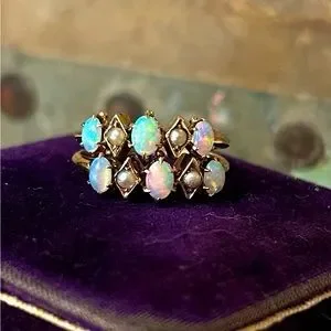 Feminine and fierce. These talon claw prongs were undeniably made in the Victorian era. Natural seed pearls and opals set in solid gold across both rows. With a staggered bulk view, this ring is hefty and subtle.