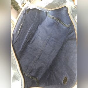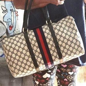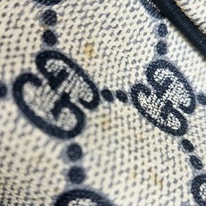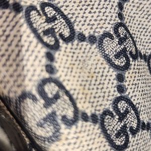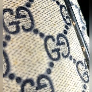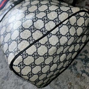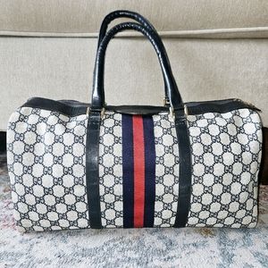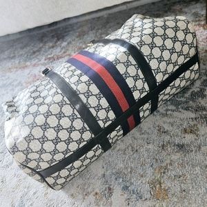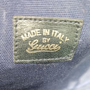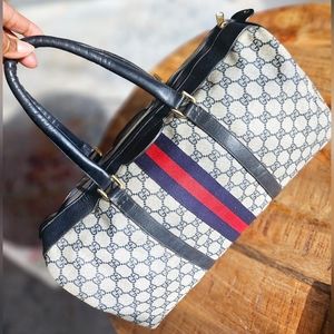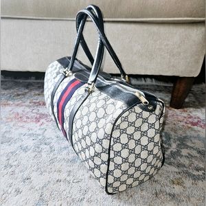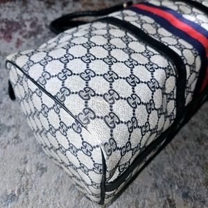 UNISEX Pre-loved Gucci boston bag in navy/red. Exterior has no holes, rips or tears in canvas. May have rubs, dirt and small stains from use. Leather parts and piping are in good condition. There may be dirt, rubs and creasing but no cracks. Two small spots on piping that peeled. Loss of shape over the years from being stored flat. Hardware has some discoloration. Interior in good condition. A few small stains/rubs.