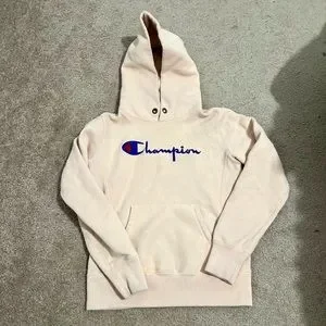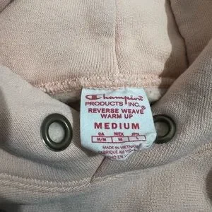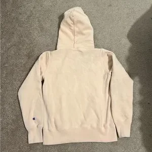 Champion women’s sweatshirt hoodie, size medium, pastel peach orange, good condition but might be slightly shrunk, no longer has its hood string