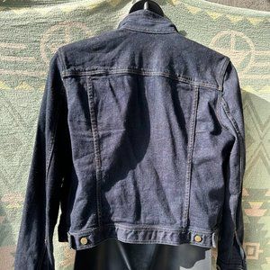 Very dark wash 98% cotton 2% elastane, vintage but never used new-without-tag, Lauren Jeans Co Ralph Lauren classic jeans jacket. Perfect. Two front pockets. Button tabs adjustment back bottom band, and two-button adjustment cuffs. All 15 logo Lauren Jeans Co metal buttons.
