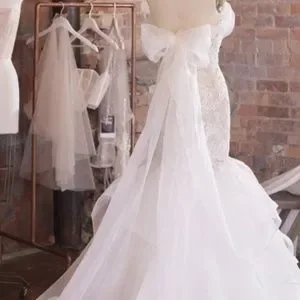It comes with small clear snaps that would need to be sewn into the inside of your gown, under the arm. The bow snaps into those clips, and then drapes around the upper part of the arm, and ties into a bow in the back! I hope this helps!