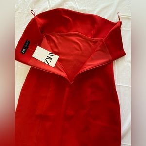 Last one ๐จ Zara Red Fitted Strapless Bodycon Midi Dress stretchy back Slit NWT