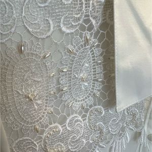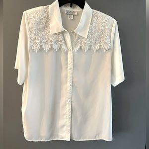 Super cute vintage blouse. Love the pearl beading with lace appliqué- is missing top button