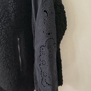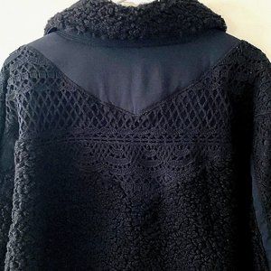 The Features: Pullover-style, half-zip closure, collared neckline, high-low hemline, crochet insets and embroidered sleeves, elastic cuffs, oversized hand pockets with zipper, water-resistant on woven fabrication