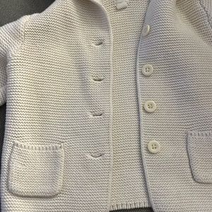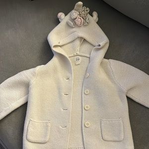 Baby gap cream sweater. 4 button closure, 2 small pockets and with a unicorn horn, ears and flowers on the hood. An adorable classic for your little one!