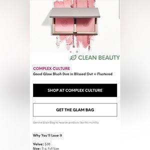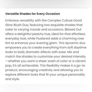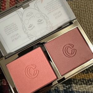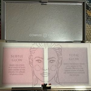A Fantastic Blush Duo! Very very pigmented and absolutely beautiful blushes. This is the COMPLEX CULTURE GOOD GLOW BLUSH DUO in BLISSED OUT and FLUSTERED! You can use it for a full on POP of colour or with a light application for a nice light natural look. You can also mix the two shades together for your own custom blush shade. One is a matte finish and one is a shimmer finish.