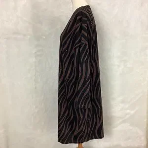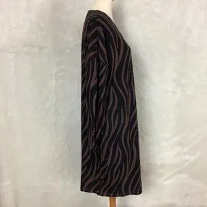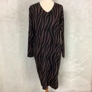This is a long sleeve, black & brown, wavy animal print tunic dress from Gudrun Sjoden. Made in Greece. No flaws. Has pockets. Mannequin specs: Size 6-8, 34 in 26 in 35 in. 100% cotton jersey. Made in Africa Initiative. artsy, lagenlook, art teacher.