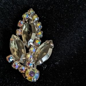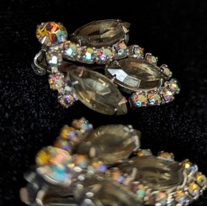 Vintage 1950's clip earrings with large smoky stones and smaller aurora borealis stones with silver tone. Juliana style appearance. Good condition.