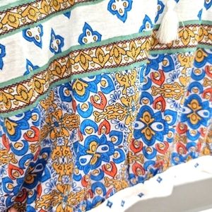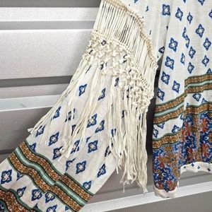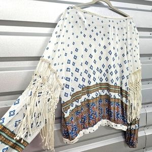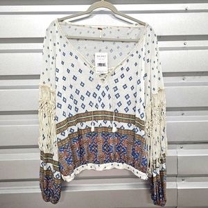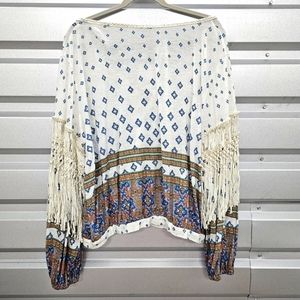 NWT Free People Lyocell Linen Macra Maze Ivory Combo Fringe Blouse