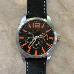 BOSS Orange Men's Analog Display Quartz Black Watch, leather strap, water resistant 30 Meters, barely used, needs new battery, mint condition