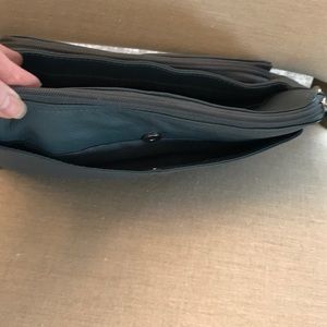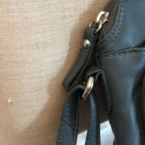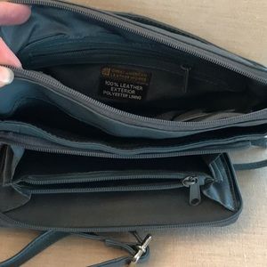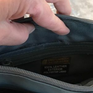 Great American Leatherworks. This crossbody is 100% leather with polyester inside. Has two slip pockets outside, one zipper compartment outside with inside zipper pocket, and main zipper compartment with inside zipper and two small slip pockets. Measures 11” w x 8” h x 3” d. In good condition. Has two small tears inside above zipper.
