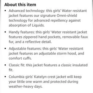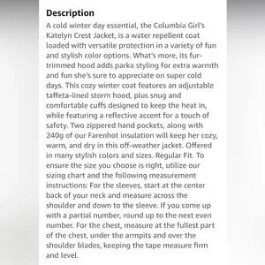 Super Gorgeous Columbia Katelyn Crest Jacket at beautiful blue color with Removable Faux Fur and Two zippered hand pockets Along with 240 g of our Farenhot insulation will keep her cozy. Used once but in excellent condition. Said size 14 but is more size 12