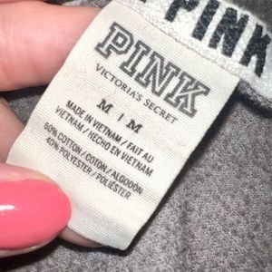 Super cute, versatile zip-up hoodie from Victoria’s Secret PINK with fully functional front zip closure, large drawstring hood, and 2 front pockets. Heather grey color throughout with “PINK” logo printed in black on the front. Perfect to pair with leggings or biker shorts for a comfy, casual look!