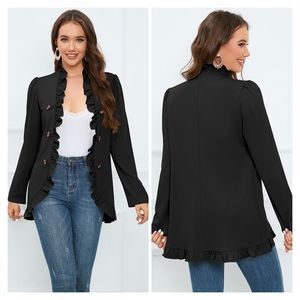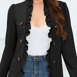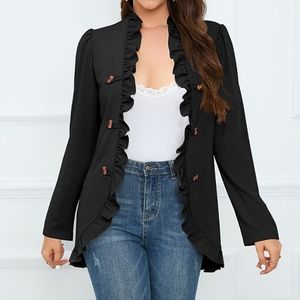 This design detail softens the structured lines of the blazer, creating a chic and versatile piece that effortlessly transitions from professional settings to stylish outings. The ruffle trim infuses a playful yet refined charm, making it a standout addition to any wardrobe ensemble.