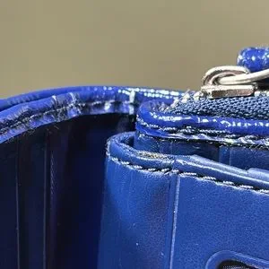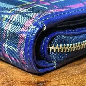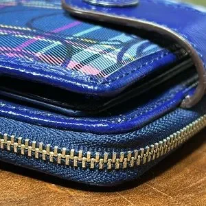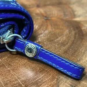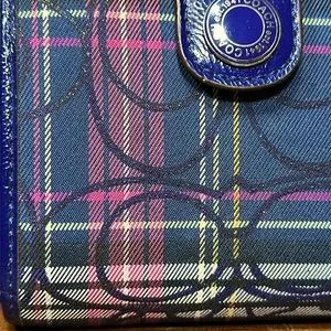 Rare and excellent condition Coach Signature Tartan Snap Wallet. Tartan colors of navy, pink, gold, light green and white with Signature C pattern in black glitter. The wallet is trimmed in navy patent leather with a patent leather snap closure flap. The exterior of the wallet is immaculate with only minor use seen! One side has a zip around accordion coin pocket with blue sateen interior that is perfect. Inside is a navy smooth leather with navy sateen pocket lining. There are 7 card slots, ID slot, 2 slip pockets and bill pocket. Leather and lining are all in perfect condition. Very minor signs of use along the inside of the patent leather trim. Hardware is silver. See all pictures for visual details. Size 4 1/2” x 4 1/4” x 1 1/4”.