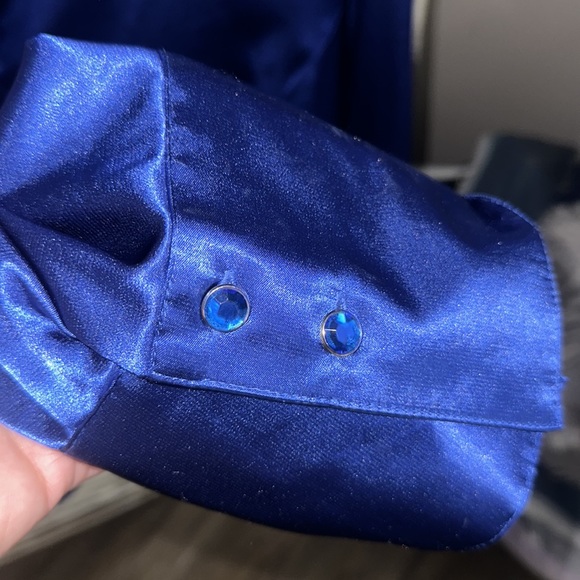 NWOT sag harbor vintage royal shiny silky looking blue long sleeve button down with blue diamond buttons also on cuffs is two diamond blue buttons so cute 🥰 size 24 w beautiful shirt 98% polyester 2% spandex smoke free home