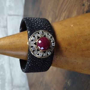 Black stingray leather cuff with a large faceted ruby corundum set in sterling silver with white topaz accents.