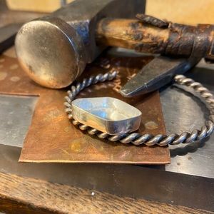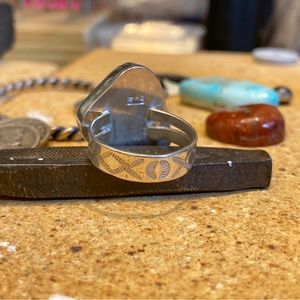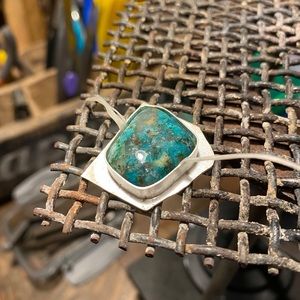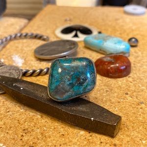 An amazing piece of silicated chrysocolla from Ray Mine in Arizona. It’s set perfectly in a bed of sterling silver with Navajo inspired stamp work on the band. All the stamps I use are vintage from the early 1900’s. I always wonder how many pieces were crafted using these. I am happy to keep them going.